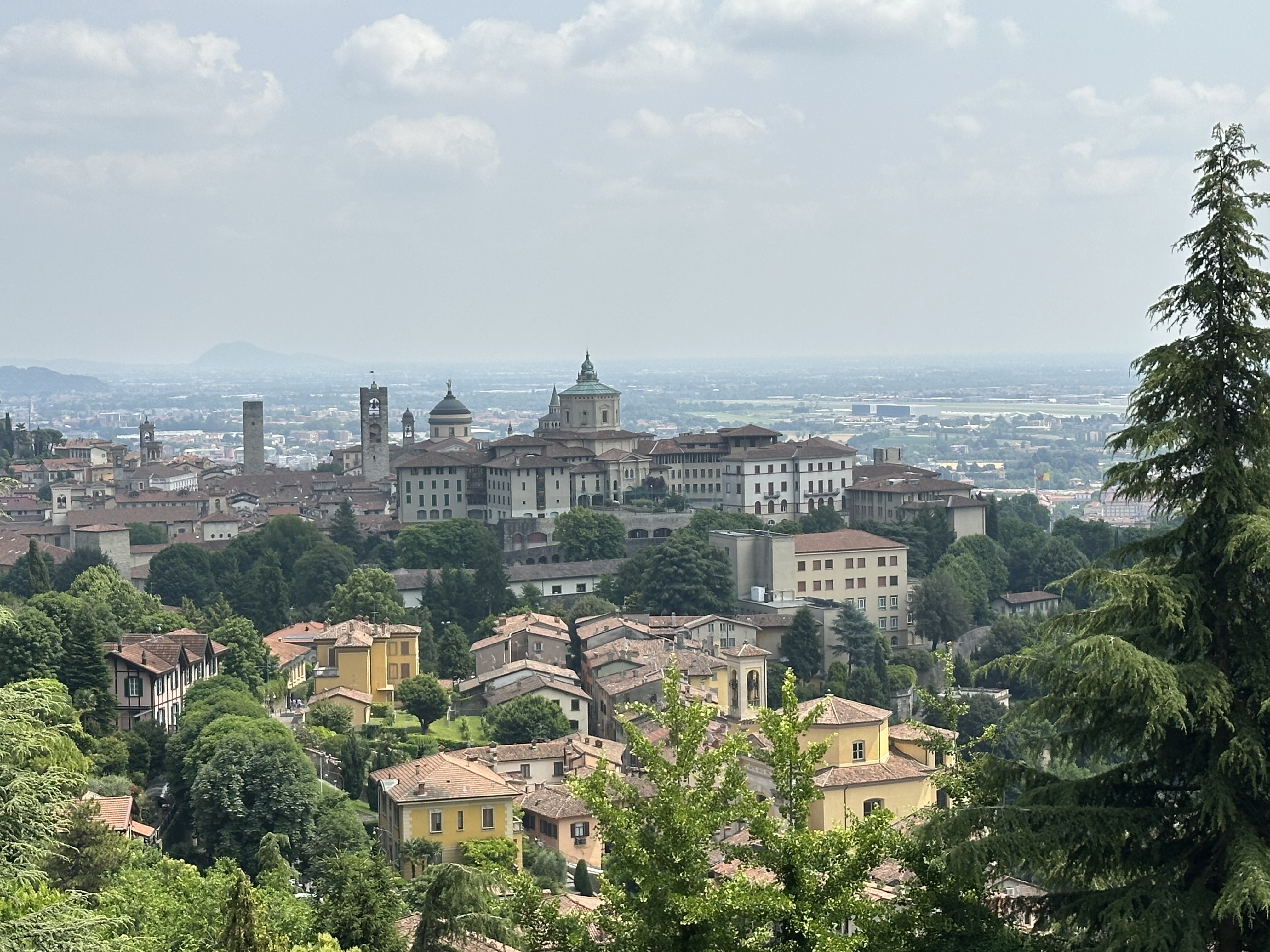 여기서 멈추지 않고, 시타 알타에서 푸니쿨라를 한 번 더 타면 더욱 높은 곳까지 올라갈 수 있다. 그곳에서 다시 산타 마리아 마조레 성당을 향해 천천히 걸어 내려오면, 베르가모 구시가지의 전경을 감상하며 여유로운 산책을 즐길 수 있다. 날씨는 무더웠지만, 아름다운 풍경과 선선하게 불어오는 바람 덕분에 기분 좋은 산책이 되었다.