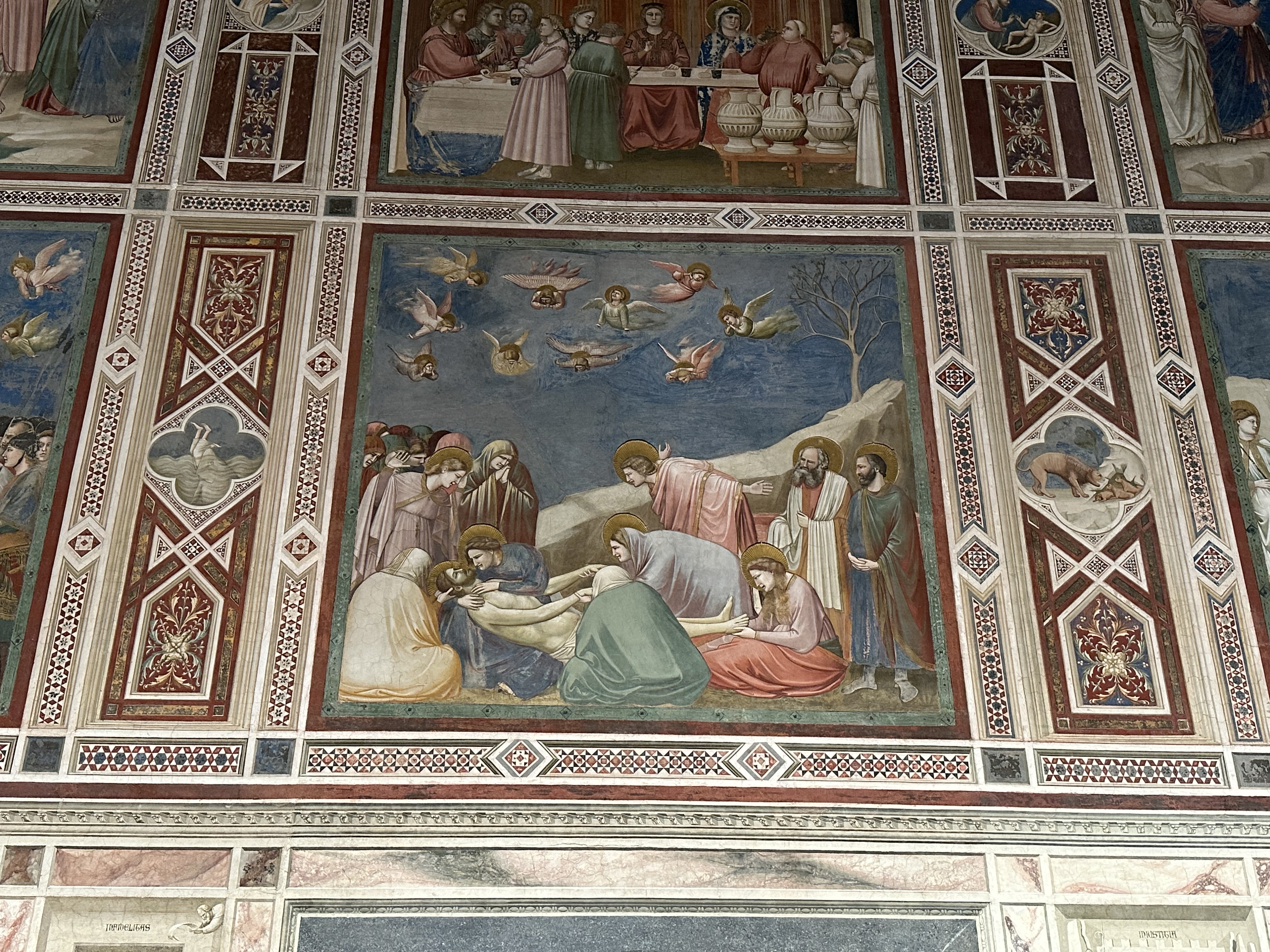 직접 마주한 스크로베니 예배당은 책에서 보던 것 이상으로 감동적이었다. 별이 수놓인 푸른 천장은 천상의 세계를 보여주고, 양 옆 벽면을 가득 채운 프레스코화는 이 공간을 지오토가 얼마나 치밀하게 구상했는지를 잘 보여주었다. 벽화를 하나하나 들여다보며 익숙한 장면을 찾아보는 것도 꽤 흥미로운 경험이었다. 특히 예수의 죽음을 슬퍼하는 인물들이 그려진 아래의 장면에서는 입체감과 감정 표현이 잘 드러나 있어, 왜 지오토가 르네상스의 아버지라 불리는지를 새삼 실감할 수 있었다.