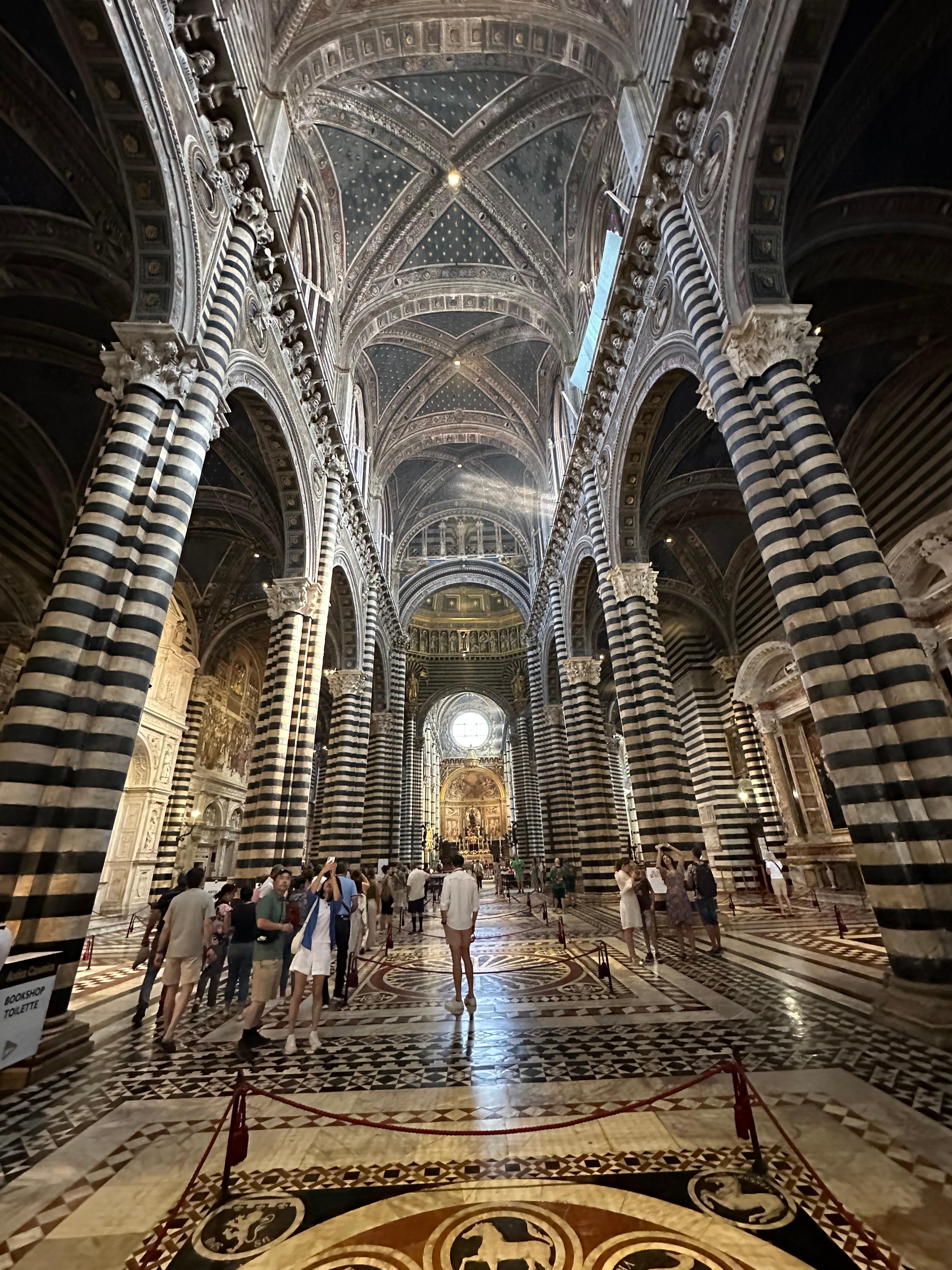 잠시 자유 시간이 주어지자, 나는 서둘러 두오모로 돌아가 직접 내부를 둘러보았다. 성당 내부는 흑백 대리석 줄무늬 기둥과 아치로 이루어진 독특한 분위기를 자아냈다. 바닥에는 수백 년 동안 완성된 화려한 모자이크 장식이 펼쳐져 있었고, 제단 위에는 미켈란젤로의 작품들이 자리하고 있었다. 어두운 성당 내부에 스며드는 빛과 화려한 장식이 어우러져, 장엄하면서도 신비로운 분위기를 느낄 수 있었다.
