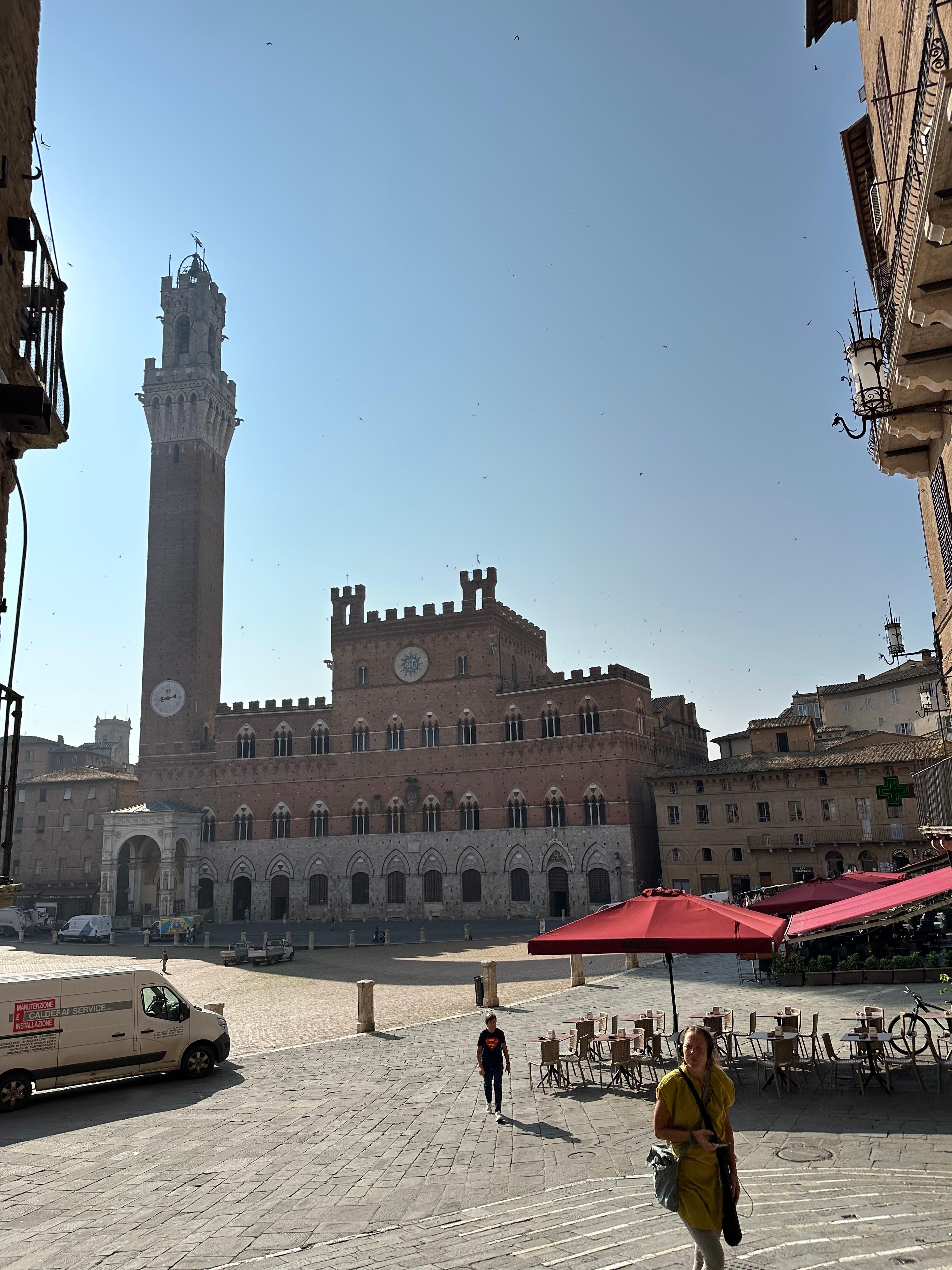 이어서 도착한 곳은 시에나의 상징, 부채꼴 모양으로 유명한 캄포 광장이었다. 이 광장은 시에나 시민 생활의 중심지로, 중세부터 행정과 축제가 열리던 장소다. 가장 눈에 띄는 건 시청사와 높이 솟은 망탑 토레 델 만자(Torre del Mangia) 이다. 매년 여름 두 차례 열리는 전통 경마 경기 팔리오(Palio di Siena)가 바로 이곳에서 펼쳐지며, 경주 때는 광장 전체에 흙이 깔리고 수많은 사람들이 몰려들어 축제의 열기로 가득 찬다고 한다.